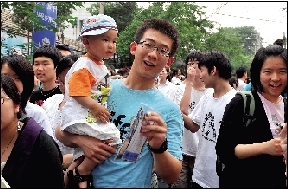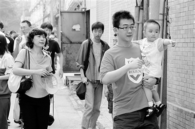 昨天下午一出考场,他就马上跑向前来迎接他的几位亲属。亲友团中,还有一个小家伙是坐在婴儿车里的。