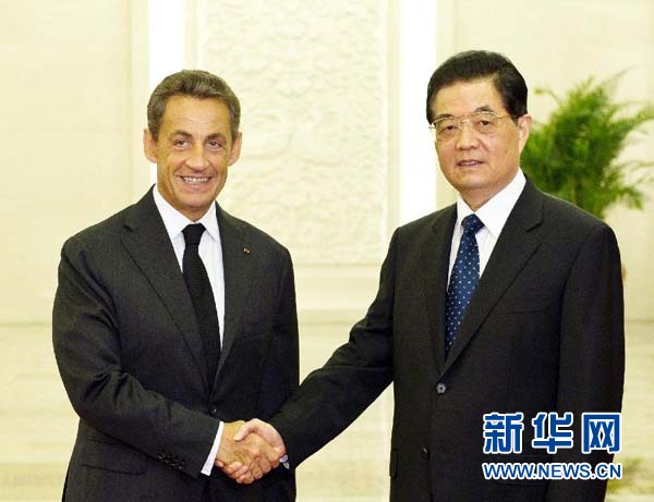 8月25日,中国国家主席胡锦涛在北京人民大会堂会见法国总统萨科齐。新华社记者李学仁摄